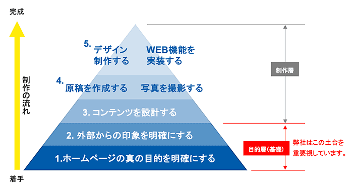 企業ウェブサイトの制作においては初めに「ウェブサイトの目的」を思考の土台(目的層)として明確にします。